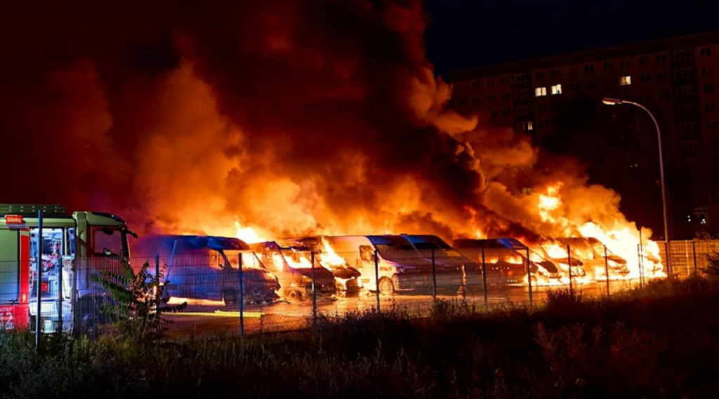 V noci z pondělí na úterý 17. června 2025 shořelo v Berlíně třicet šest dodávek patřících válečným spekulantům Telekom a Amazon: 17 vozidel první z těchto firem ve čtvrti Lichtenberg a 19 vozidel druhé ve čtvrti Britz, a to v rozmezí několika minut kolem třetí hodiny ráno.